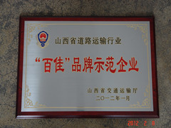 2012年2月8日,在山西省道路運(yùn)輸工作會(huì)議上,我公司獲得由山西省交通運(yùn)輸廳頒發(fā)的山西省道路運(yùn)輸行業(yè)《“百佳”品牌示范企業(yè)》榮譽(yù)稱(chēng)號(hào)。