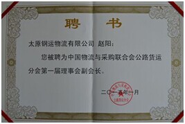 2015年3月5日受中國物流與采購聯(lián)合會邀請,公司總經(jīng)理胡永生赴上海參加中國物流與采購聯(lián)合會公路貨運(yùn)分會一屆二次理事會。我公司被大會選為“中國物流與采購聯(lián)合會公路貨運(yùn)分會副會長單位”,公司董事長趙陽被聘為公路貨運(yùn)分會****屆理事會副會長。